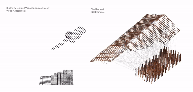 The objective of the project is to showcase how matching algorithms along with generative design and digital fabrication can be used to integrate materials retrieved from pre-demolition sites to develop new structures, while minimizing waste and maximizing efficiency.