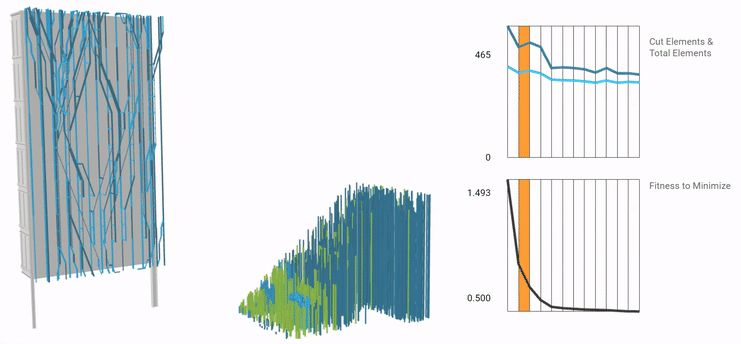 A genetic algorithm applies small translations to the geometric inputs of the facade, and minimizes a total fitness value calculated from the previous analysis. Inputs are weighted to favor efficient reuse first, with the structural results only disqualifying an iteration if the system proves to be very unstable.