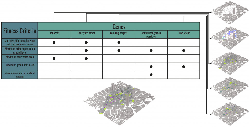 The evolutionary matrix demonstrates the relationship between the different variables (gene pools) and the set fitness objectives. This also illustrates how some variable control the growth and iteration of several objectives at the same time while others limit this growth providing a constructive conflict.