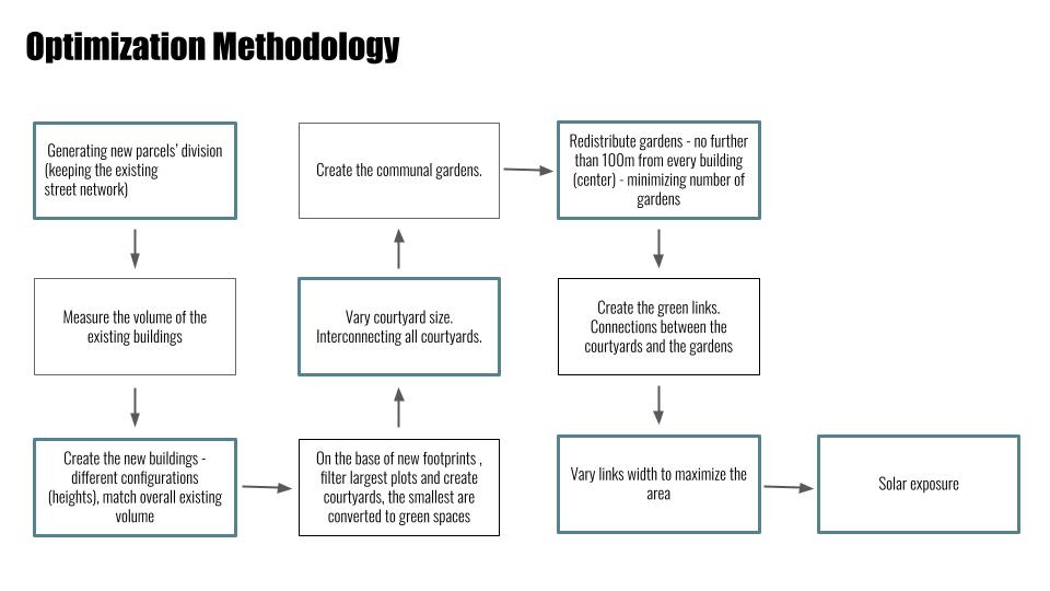 The aim of the project is to optimize the urban fabric, massing and solar exposure while maintaining the existing total built area. In addition, one of the main goals is to achieve the highest possible open and green spaces while ensuring accessibility and optimal connectivity to all newly generated buildings.