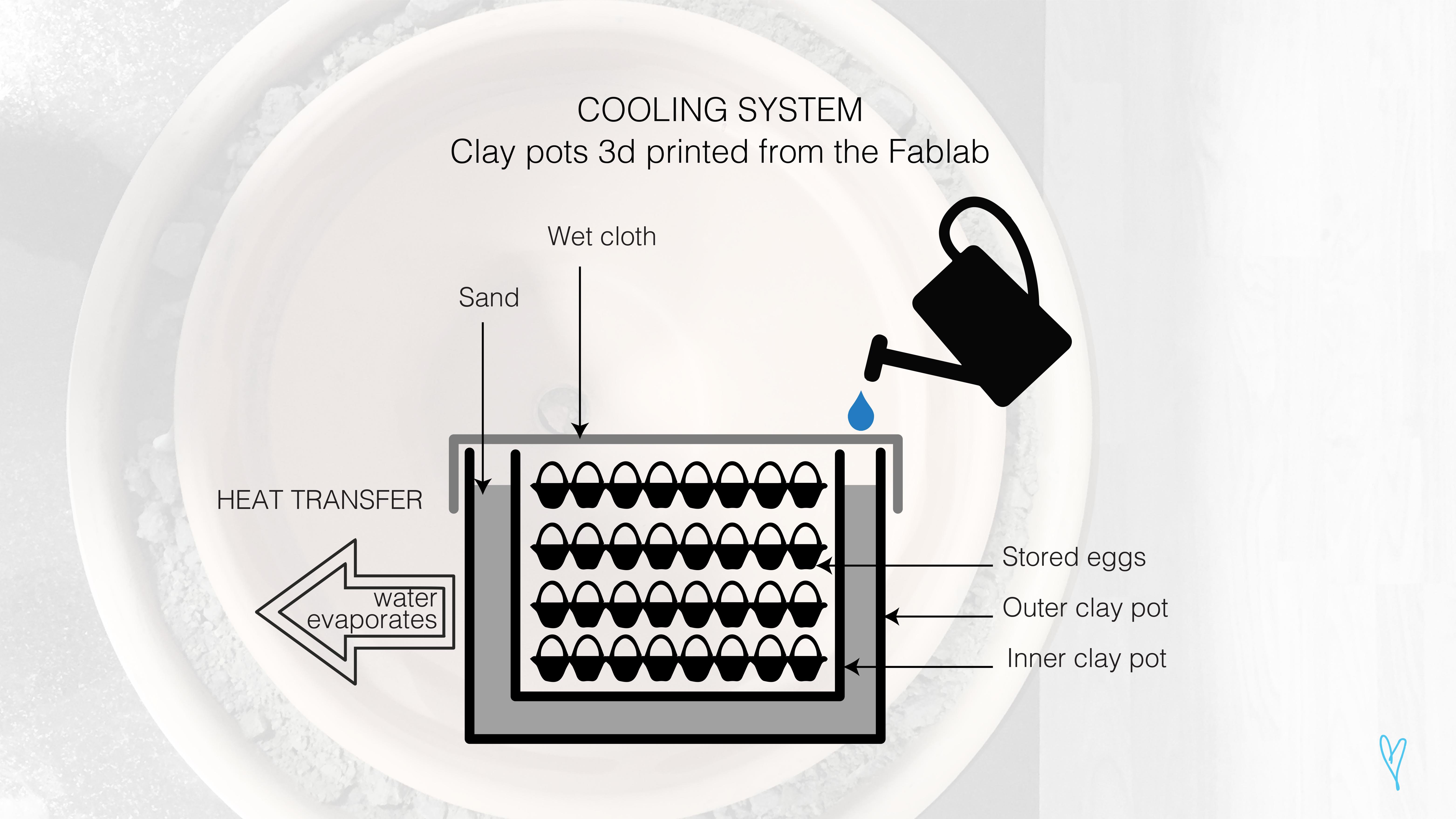 We were able to find a no-tech cooling system that will be fabricated with the help of the fablab and simply made out of clay and wet sand that will only require watering the sand every now and then for the eggs to be kept cold.