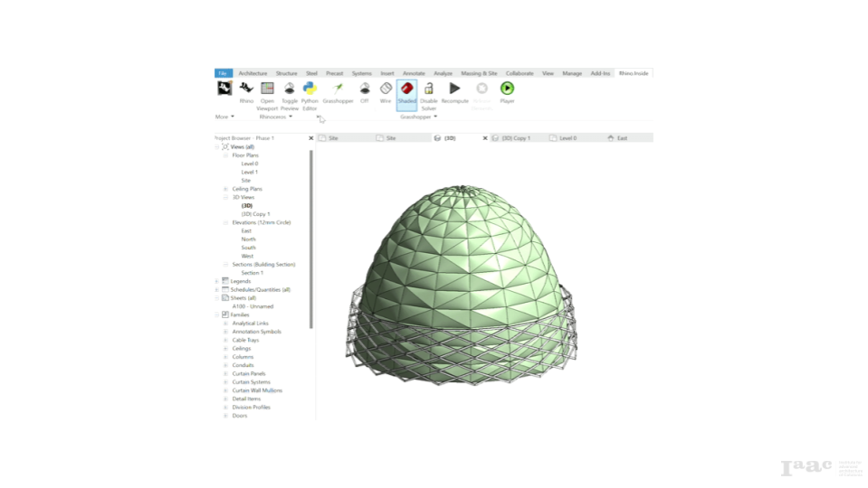 As the project developed, the team reversed roles so that the member engaging with other lunar groups also manages the parametric model and all global geometry within Rhino + Grasshopper, with regular data exchange with other groups via Speckle. The parametric file would then be included in Revit through Rhino.Inside.Revit. Any changes in the Grasshopper script would require the Central Model being updated by simply using the “update and replace” feature by Rhino.Inside. The other team member would then focus on preparation of the central BIM model for documentation in Revit, creating all the families, greenhouse equipment and drawings to be added to the Central Model; changes in families could easily be accommodated by loading and overwriting parameters in the project.