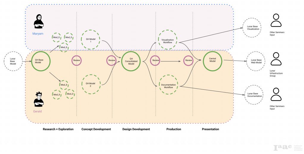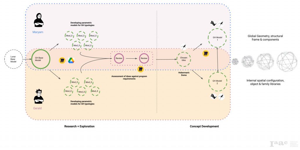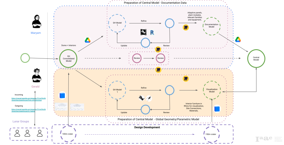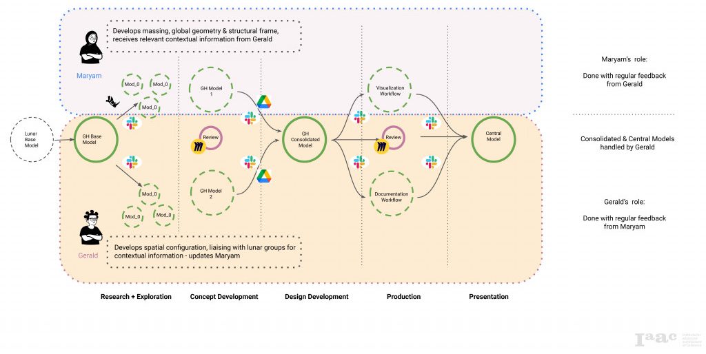 The roles were split amongst the team such that one would develop the global geometry and structural framework on one hand while the other focused on spatial configurations and maintaining contact with the external groups for evolving changes to the lunar habitat and any other contextual information relevant to the lunar greenhouse. Cloud-based platform Slack was used the primary communication contact point, and Miro was used for curating the design ideas and regular reviews, while keeping all project files stored on a shared Google Drive.