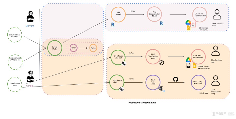 This project focuses on the inter- and intra- group collaboration between thirteen students developing a lunar base design, split into 5 groups with different programs, detailing on the greenhouse team of two members challenged with communication, interoperability and data sharing virtually. Consequently, collaboration had to be maintained internally within the lunar greenhouse group and also externally with the other 4 groups, to varying extents throughout the project.