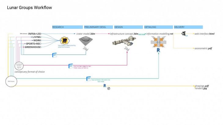 The external collaboration was mostly done in a linear approach, the infrastructure group as a key player and custodian of the contextual framework regularly received the models and data from all the other groups via Speckle, then developed the crater and necessary connection nodes to various precincts other lunar groups were working on. Each lunar group had a unique stream with two branches to receive from, and share to the infrastructure group, distinguishing the data exchange, avoiding overlaps.