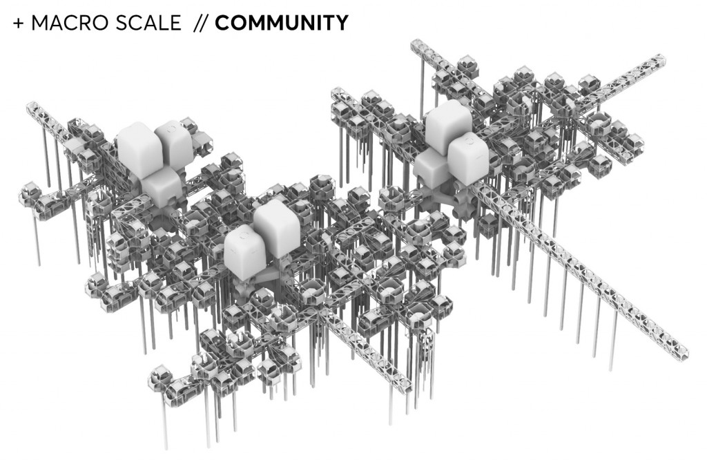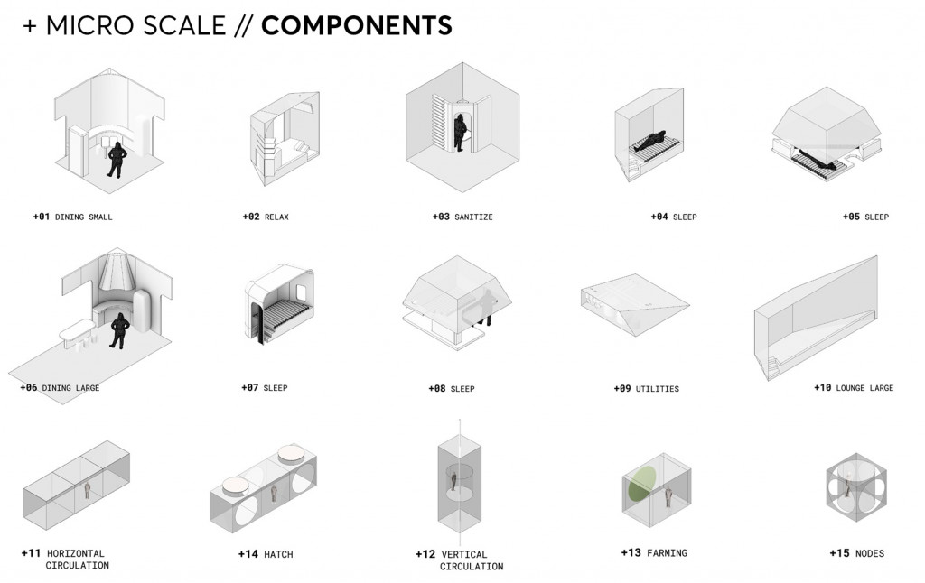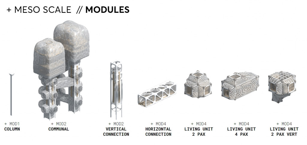 The three scales of the project: MICRO + MESO + MACRO that allowed us to create a detailed module that can grow and adapt to the multiple circumstances in the moon. Below is a breakdown of each of the levels.