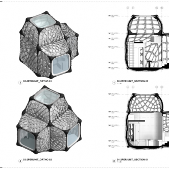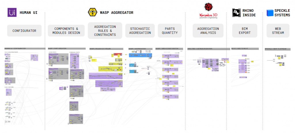 In order to have a direct and seamless integration between Rhino-Grasshopper and Revit, the BIM software used to create the construction documentation, we make use of Rhino.Inside. This new development allowed us to convert all the necessary geometry and data onto smart native BIM families and components. All the parts of the project, from the skin, structure, levels, and grids to the interiors of each unit were converted onto a series of Revit families that were positioned in place using the “add component by location”. Below is a diagram that shows all the different families that were created for each module: