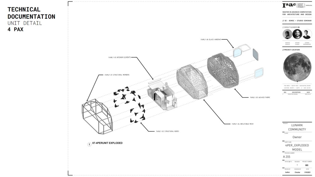 For the seminar, we used the project we design for the Studio seminar called “Lunar Residency”, which is a spatial modular community in the moon. To know more about the project you can click on this link. The Project was designed as a kit of parts that aggregates using a rule-based system in order to create a modular and organic growth based on the needs and demographics of the community. We fully embarrassed the idea of modularity as a way to create a progressive and automated construction system using robotic and 3D printing fabrication techniques. This also allowed us to create an assembly sequence that can be easily detailed and documented on the BIM software.