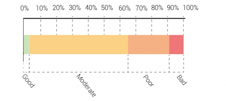 Most of the Luxembourg rivers are moderate or poor water quality, both marks represent more than 80% of the rivers which is alarming, If we compare that less than 5% of the rivers are in good quality or not polluted.