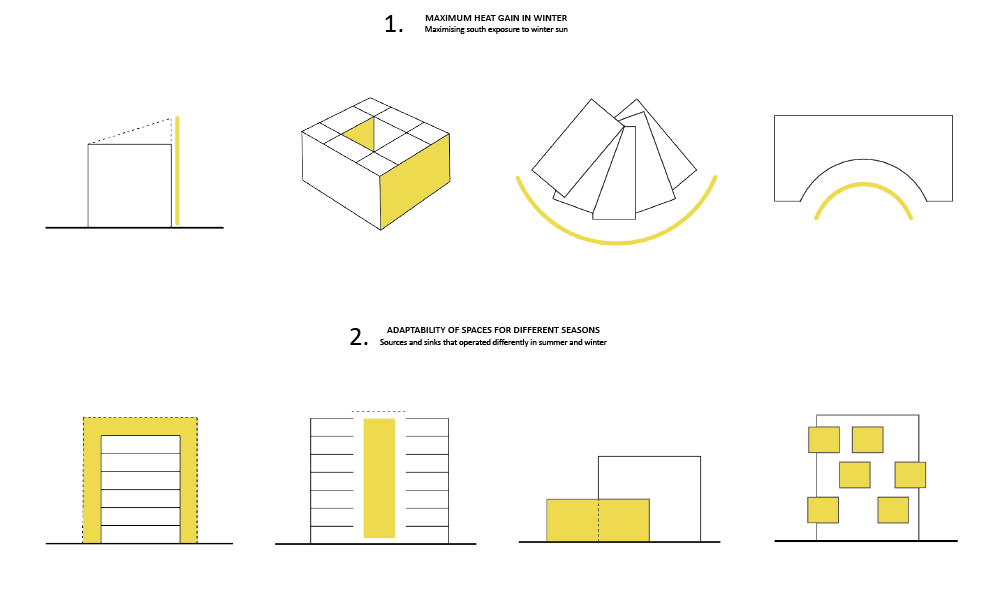 The analysis diagrams on the right show the sun path and wind direction for both winter and summer season. The sections explain how the design responds to these climatic conditions in both the seasons