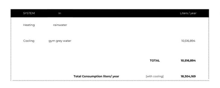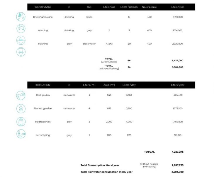 The table below shows a breakdown and details out the water consumption for every function in the educational and market facility.