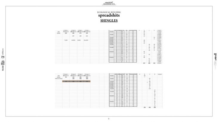 The MAEB team was invested in using freshly harvested oak from the Colserolla Park for the prototype house envelope. Accordingly MAEB was challenged to find solutions for warping of the wood which occurred after processing the lumber to produce shinThe envelope shingles were produced to fit 4 different dimension groups. These groups were designed to optimize the number of shingles that could be produced to cover the prototype house from the existing lumber harvest, as well as match the particular dimensions of the existing lumber as well as the morphology and proportions of the house: