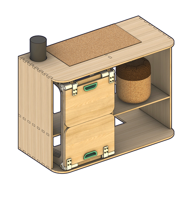 Since we are given 2 pieces of plywood sheets and the table only takes 1 and a quarter to be built. We chose to come up with another piece of furniture, which mainly acts as storage for the folding table and a shelf for daily use items. Instead of including 3D printing joints, this time we chose to experiment with the intersection joint of the wood itself. By responding to the context, the shape of the wooden piece is cut to avoid the heater.