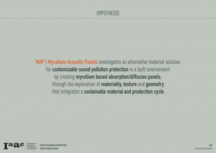 MAP | Mycelium Acoustic Panels is a project of IAAC, Institute for Advanced Architecture of Catalonia developed in the Master in Advanced Architecture 2019/20 by Student: Kristine Kuprijanova and Faculty: Alexandre Dubor and Raimund Krennmüller