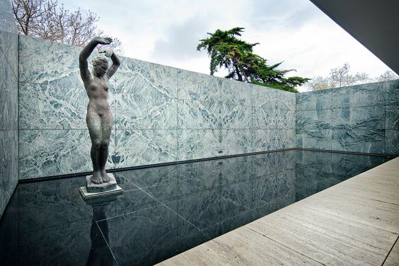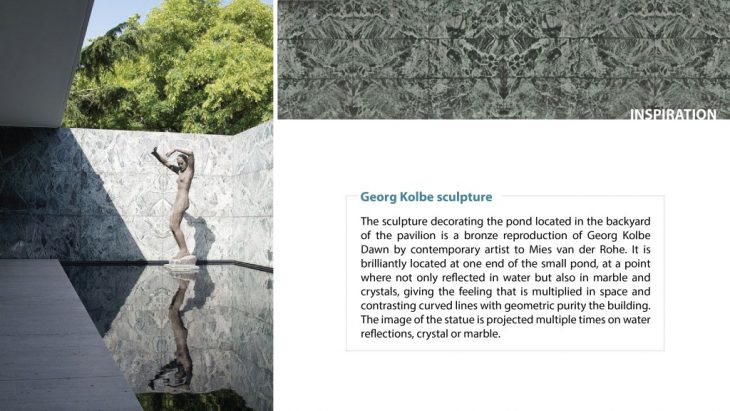 The element to intervene in the pavilion was the water mirror located in the back, an intimate space with a sculpture on the water, delimited by a wall with a marbol finish with blue and gray shades that highlight the texture and its organic pattern .