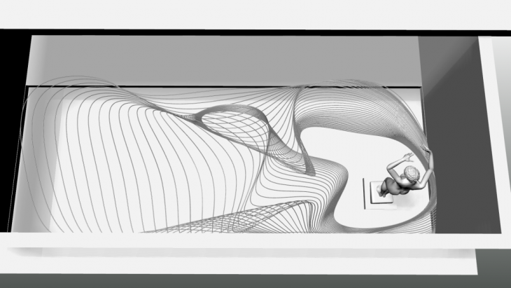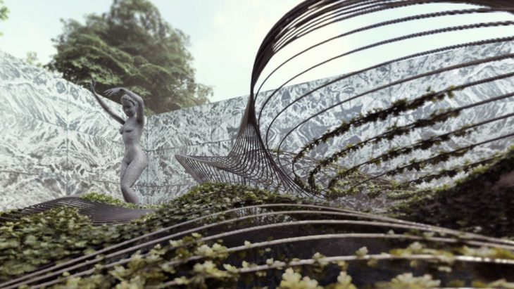 The element of recursive topology aims to reinterpret the texture of the marbol that surrounds the space and incorporate the existing statue to generate, through sinuous profiles, a new platform of multiple uses on water.