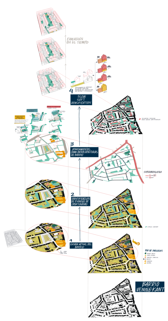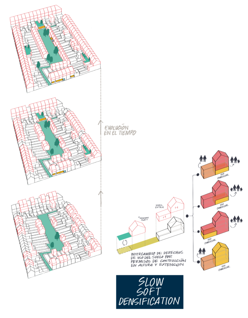Las nuevas vías publicas de acceso al interior de la manzana propuestas abren la oportunidad para nuevas ampliaciones, tanto adyacentes como separadas del volumen principal, así como la introducción de nuevos usos comerciales. La intención es catalizar un proceso de “slow soft densification” impulsado principalmente por los habitantes mismos de la zona.