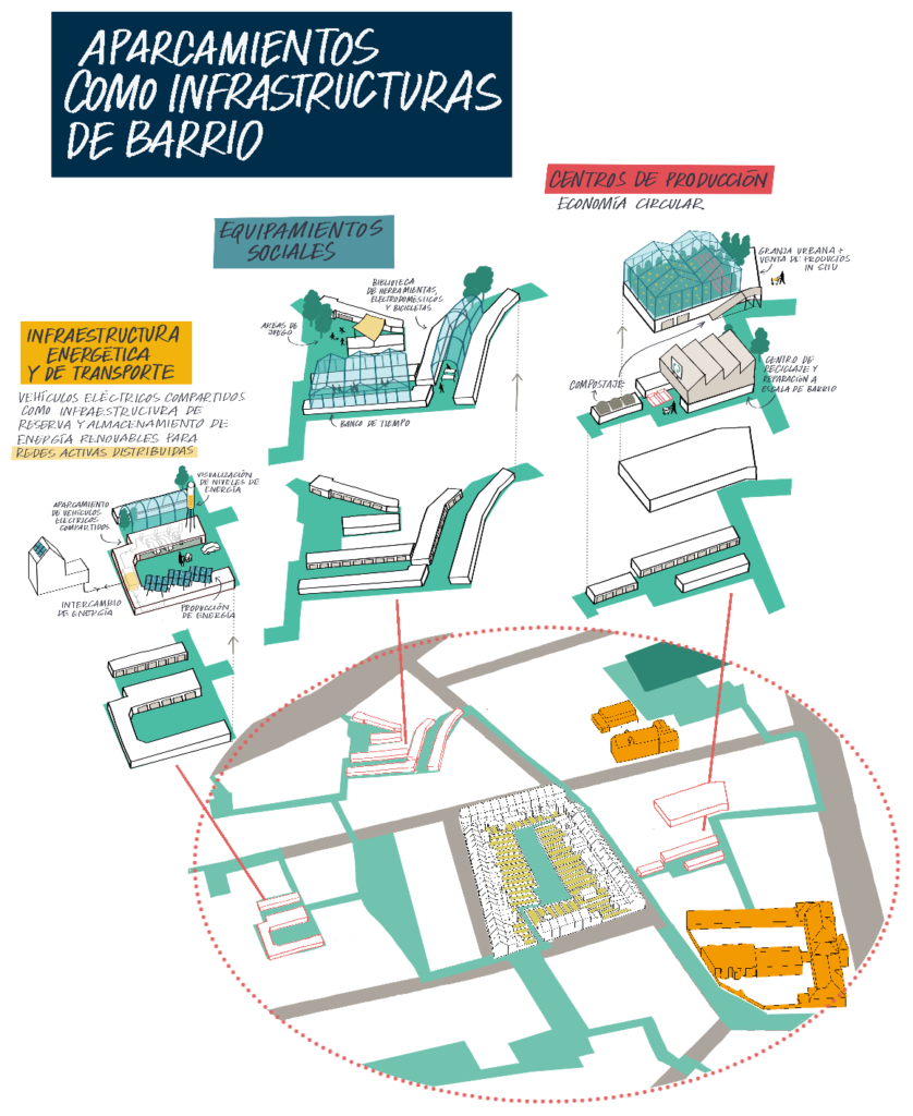 Tras el análisis del uso de las parcelas se detecta la existencia dentro de casi cada una de las manzanas del barrio de grandes superficies dedicadas a garajes privados que suplen la deficiencia de parking en la zona, así como la ausencia de garajes de las viviendas adosadas. Sin embrago, con el uso de servicios de vehículos compartidos al alza, se prevé una reducción considerable de la necesidad de garajes privados. Esto abre una oportunidad para convertir estas parcelas en espacios de públicos y equipamientos de barrio que rindan servicios energéticos, provean de nuevos equipamientos sociales y permitan usos productivos de economía circular. La apertura de conexiones del exterior de las manzanas a estos espacios interiores crea también la oportunidad de generar nuevas vías verdes y rutas peatonales alternativas a las calles existentes.