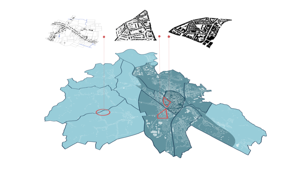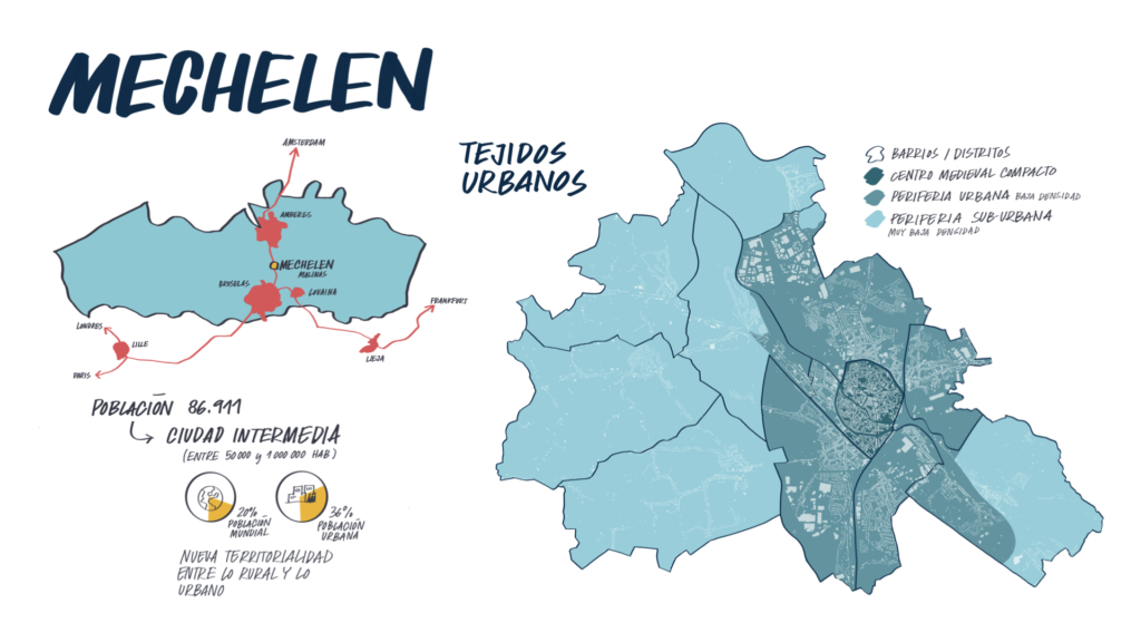 Mechelen es una ciudad belga de tamaño pequeño a mitad de camino entre Bruselas y Amberes. Morfológicamente, repite los mismos patrones de crecimiento que la mayoría de las ciudades flamencas, con un centro medieval compacto, una periferia urbana de baja densidad y un “urban sprawl” lineal a lo largo de las carreteras de su entorno rural.