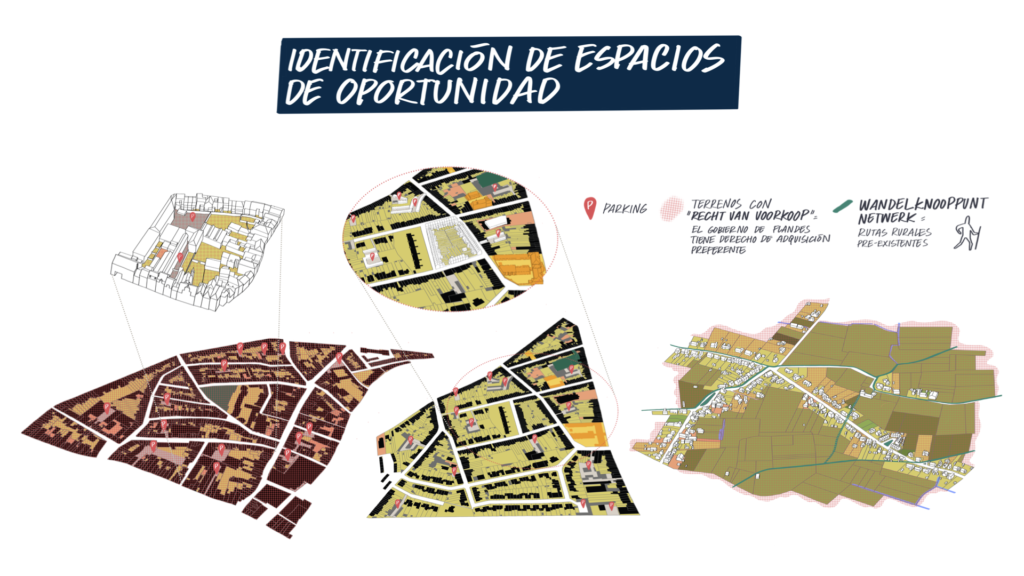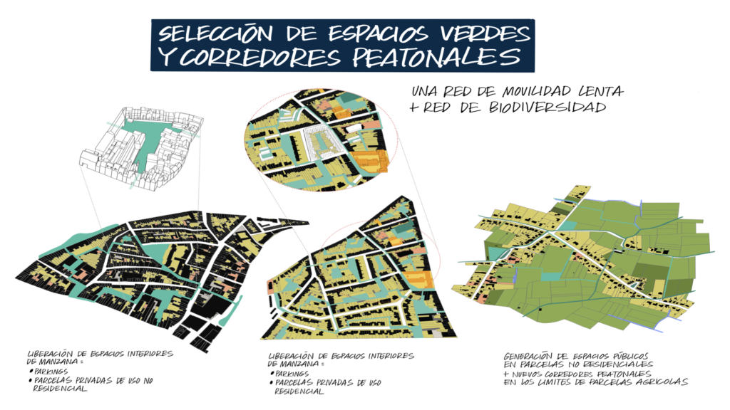 El primer paso del proyecto es identificar espacios de oportunidad en el interior de las manzanas que permitan crear nuevos espacios verdes públicos y semipúblicos en la trama urbana. Estos espacios se conectan entre sí on corredores peatonales verdes, que generan una trama peatonal independiente a la red de movilidad existente.