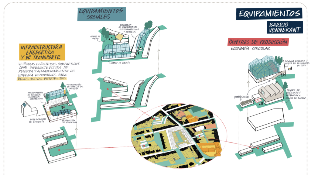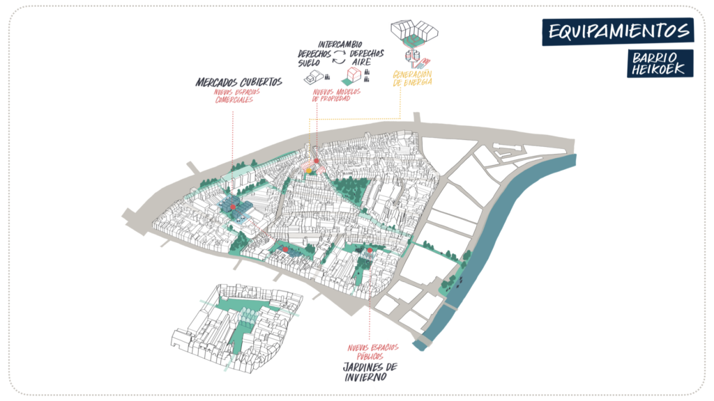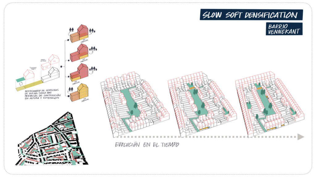 Esta nueva red de movilidad genera al mismo tiempo oportunidades para una densificación bottom-up, basado en un sistema de permutas: los propietarios pueden intercambiar el derecho de uso público de parte de su parcela privada por permiso de una mayor edificabilidad de su parcela, posibilitando usos mixtos en manzanas hasta ahora exclusivamente residenciales.