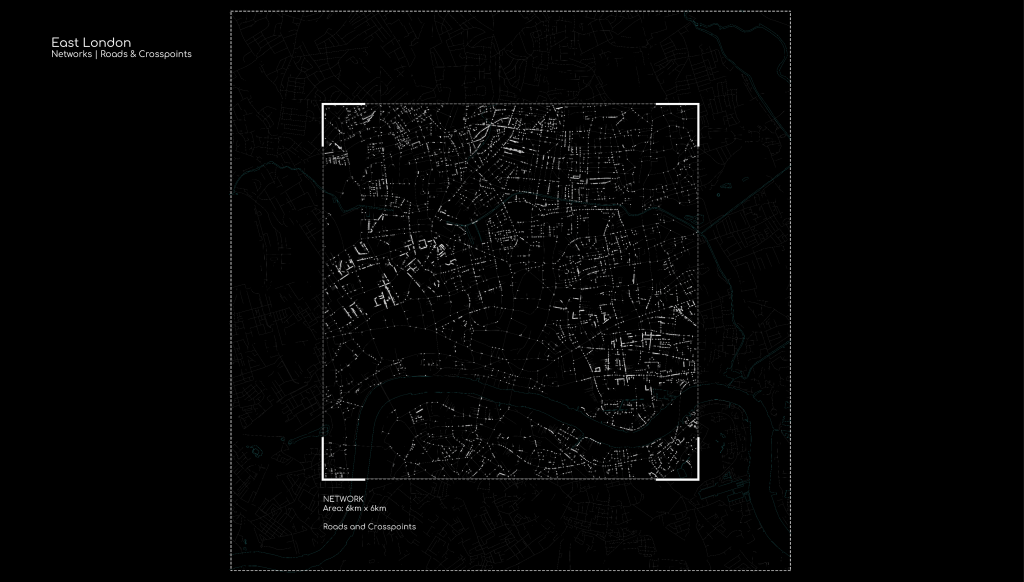 The first step in the research is to map the street network with the intersections in London. This shows the contrast in density as the number of data points is not homogeneously distributed.