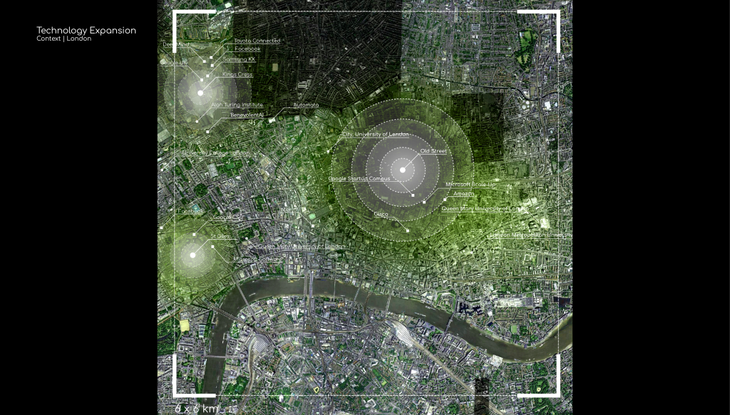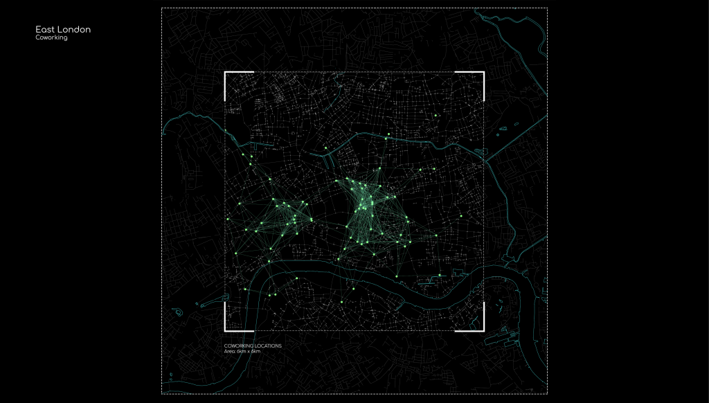 Speculating that these changes will be reflected within the coworking spaces which have the potential to start breaking into the urban fabric. Vice versa, the residential fabric has the potential to contaminate the deserted tech city creating a homogeneous landscape.
