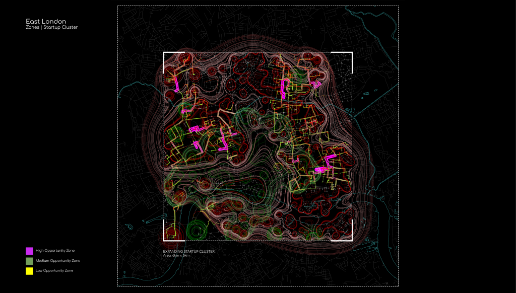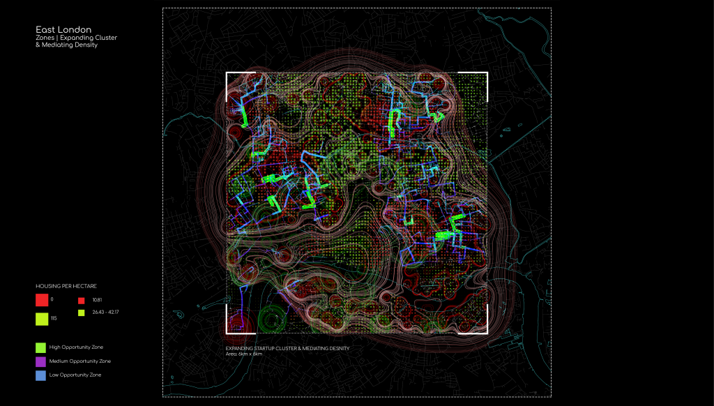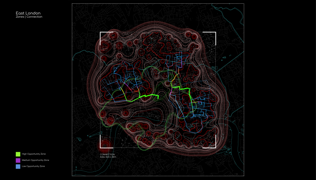 The green zone was created with the shortest walking distance between the residential centers and the tech industry centers. It forms a zone with the opportunity for a new form of coworking spaces to mediate the two typologies.