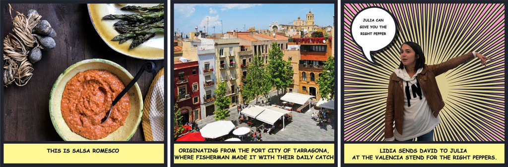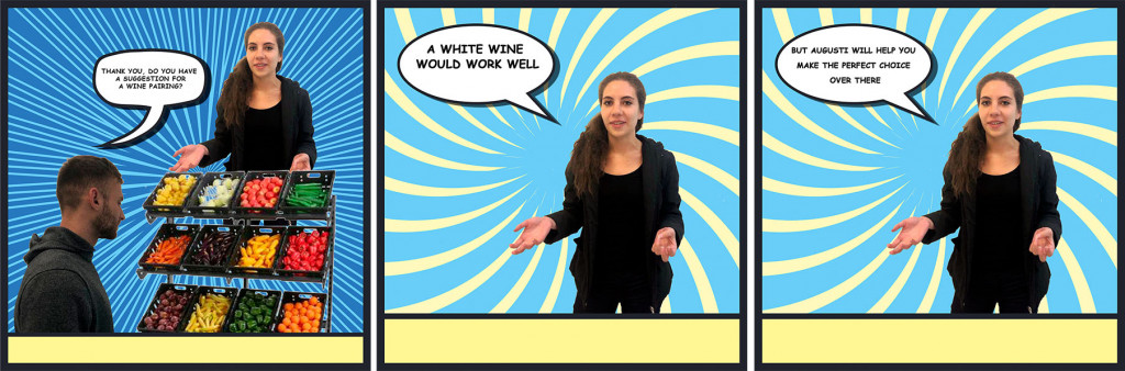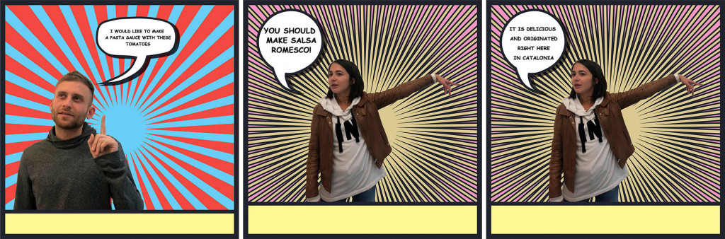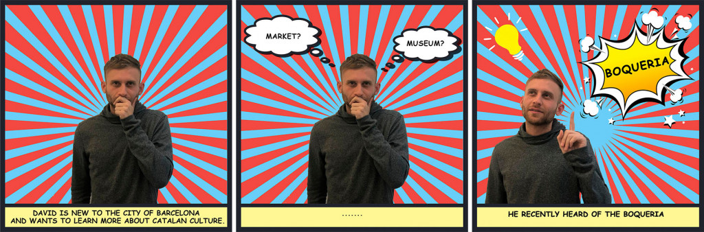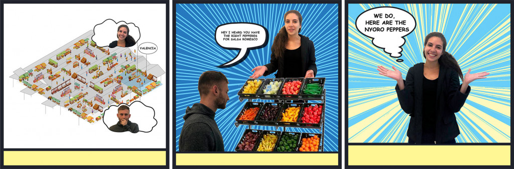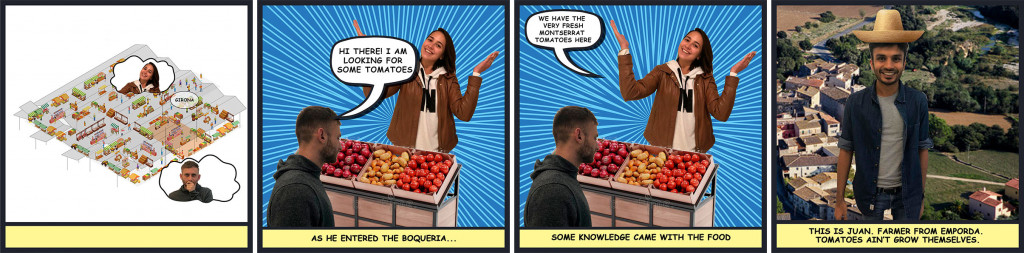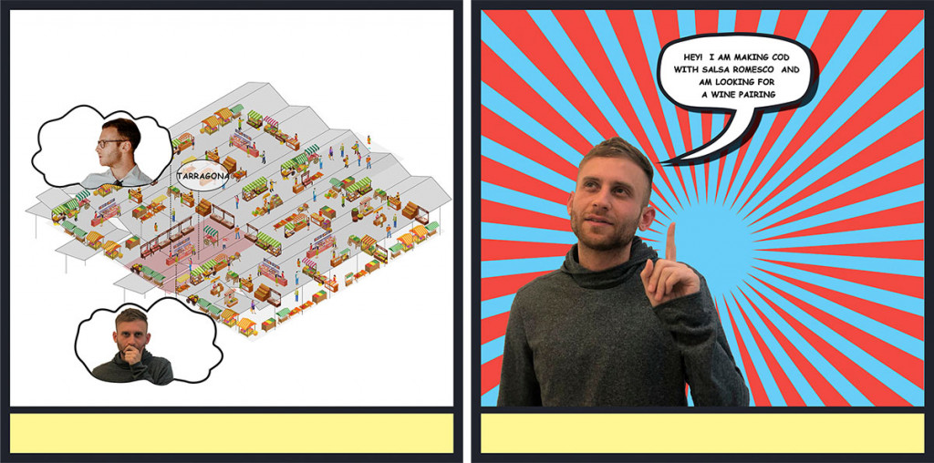 Therefore, our project proposal for the market was to both redesign the physical space and market operations to improve the value of food and the interactions between the “merchants” and the “consumer.” The proposal was to change the market into a “Knowledge Sharing Food Habitat,” meaning the “merchants” are hired by the market as “food curators” of their territory, working with each other to share knowledge about the food to the consumer. The physical space will also change into more of an art exhibition feel organized by Catalan territory, designed to keep the consumer engaged with the “food curators” and the stories behind the food. For the presentation, we decided to present a comic series to demonstrate the journey that the consumer takes and how the people he meets and the knowledge he gains enhances the food he or she ends up purchasing.
