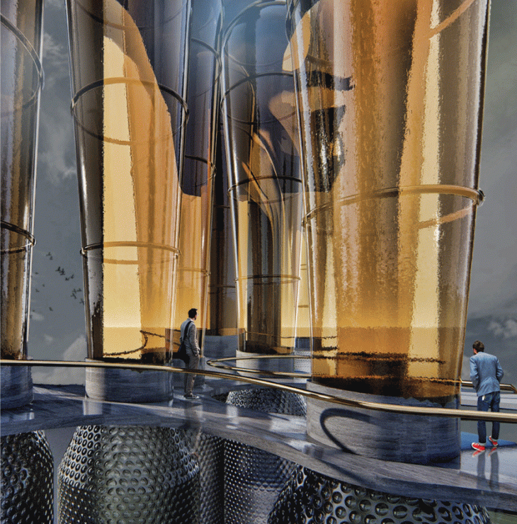 The building works by compressing air through the proposed lift shaft, which is the released into a chamber where its filtered with water.It is then follwed by filteration using HEPA filters in the second chamber. The cleansed air this then released into the atrium and hence the atmospehere. The contaminated air is then segregated into NO2 and O3 which is strored in the collection chambers.Through prototyping, the processes of the metabolism are investigated.