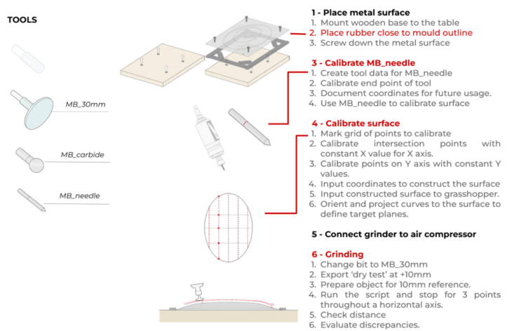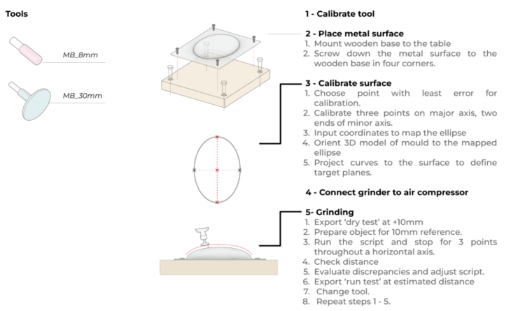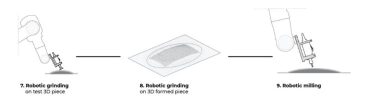 This is the final step of our production, as we put everything we have studied previously into testing. The robotic grinding on curved surfaces brought a number of unexpected challenges and called for improvisation such as re-adapting the end-effector for another function, milling.