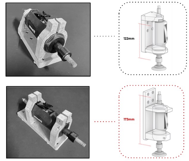 Regarding assembly, we created mock-ups using MDF to determine what would be the ideal way to install onto the robot. Given that it will be mounted onto the robot as the last step, we chose the design that places the Prevost 173mm below the center of the ABB’s end-effector. The final end-effector was in aluminum, taking these tested dimensions and assembly method.