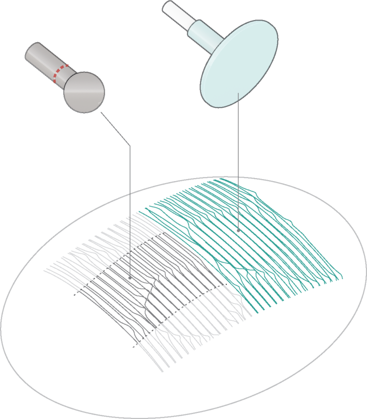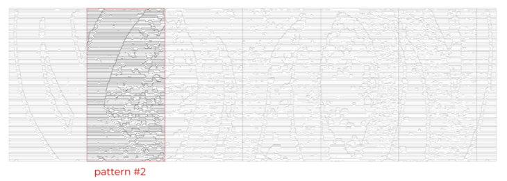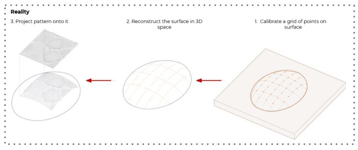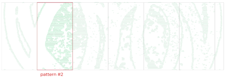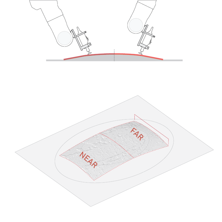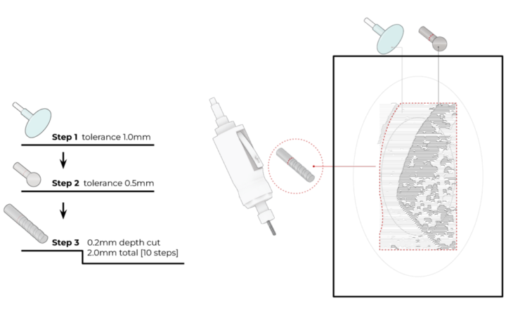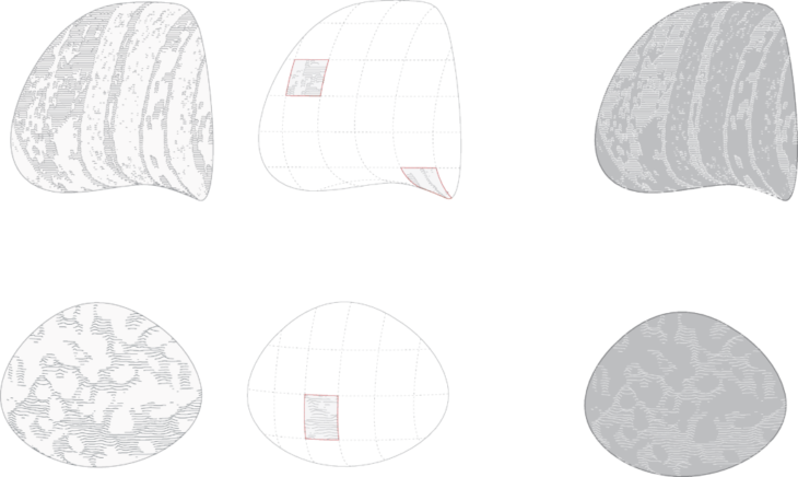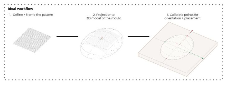The pattern is defined flat. It is then projected to the mold, translated into different bits and different plane rotations for the robotic grinding.
