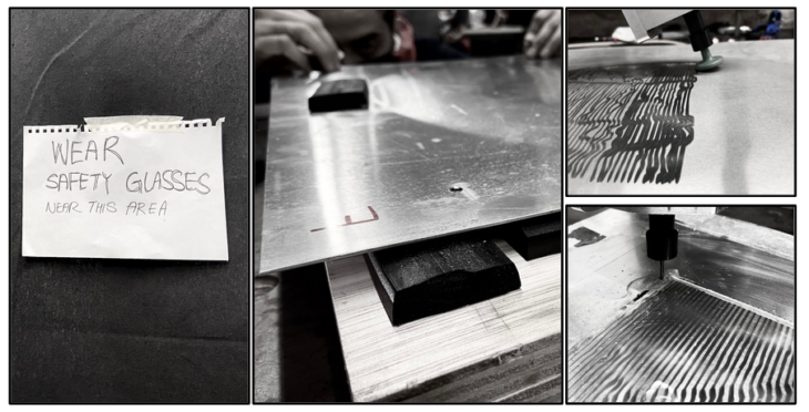 The grinding tool available to us is Prevost TDG S2200R. We explored this tool manually on three different metal surfaces, with three different grinding bits. The tool was then used to create a manual texture library for us to refer from and make design and production decisions. The Texture Library also contains different type of sheet metals: Raw Aluminum, Brass & Raw Steel.