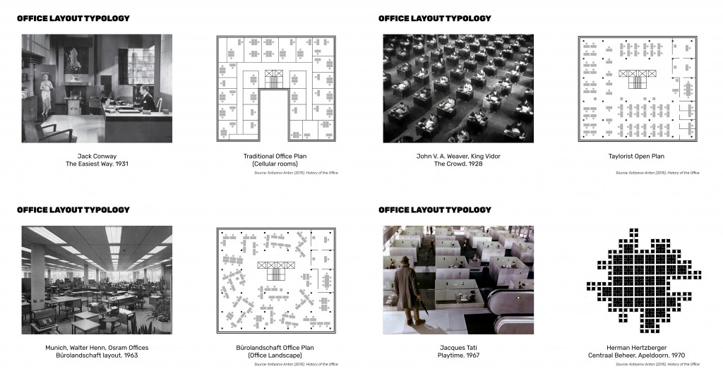 There were different types of office layout in history. Those layouts analysis shows us the developments of office space. From those research on the historical layout, it is easy to see the trend of how the office space changed during time. If we take a glimpse of the future, office in the future is going to be more mixed and flexible. A lot of office in Sant Marti now were using mixed office plan. Which enhance the possibility for space tolerates more function inside.