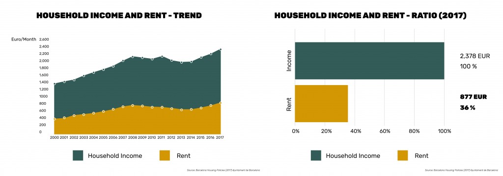 The graph(Ratio) on left shows In 2017, the average rent comprised 36% of the average disposable household income in Barcelona, which is 6% more than the recommended ratio. Housing price is an issue that affects everyone in Barcelona, but disproportionately more so for the low-income population.