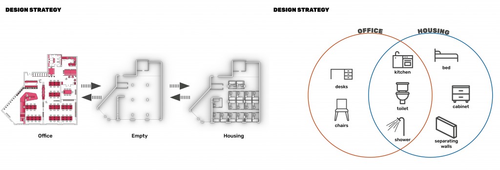 The design strategy of this project is based on the original office plan. Firstly, empty the whole working zone of the office. And then, implement the design inside the office to make a new typology of space. Finding the common elements in two functions can also guide the direction of the design.