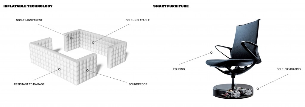 To be able to achieve our design proposal, ‘Inflatable Technology’ could be a good solution. Using the soft material to reach the flexibility purpose. As for the furniture inside the office, ‘Smart Furniture’ could be a way to solve the problem. So the furniture could achieve mobility inside the office and optimize the usage of space.