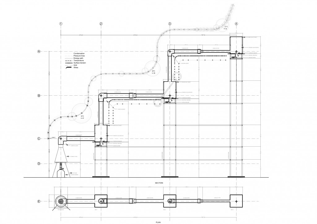 To further understand the site’s unique and unusual microclimate, we constructed a sensing device that maps the different conditions of humidity and temperature, along the site. The sensing device consists of a surface that holds the mechanical system required for the temperature and humidity sensor. This system is protected by an elevated sheet that sits on columns and is connected by magnets.