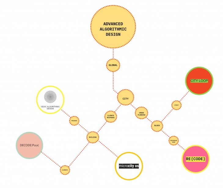 In the Advanced Algorithms Design Studio we explore multi scalar strategies to develop architectural solutions. Our projects: RE{CODE}, City Loop, Vedic algorithmic design, Decode Puuc and MicroCity OS were categorized accordingly for the group cosmogramme.