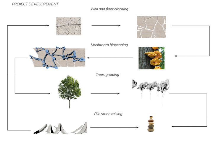 The purpose of this assignment was to create an installation in the Mies Van der Rohe pavilion, using the Grasshopper plug-in, Anemone, as the main tool. The scenario I have imagined for this assignment is a post-apocaliptyc future where a devastating war has completely destoryed our civilization. Not even this Architectural Master piece has been saved from the cathastrophic downfall. The wall and the floor are completely cracked. Disgusting mushrooms, chemically mutated from the nuclear atmosphere , blossom through the cracks. Stone piles represent the memory of the brave warriores,. These piles will remain as a timeless reference. However, new life grows. Fragile sapling are a promising sign of a new begining.