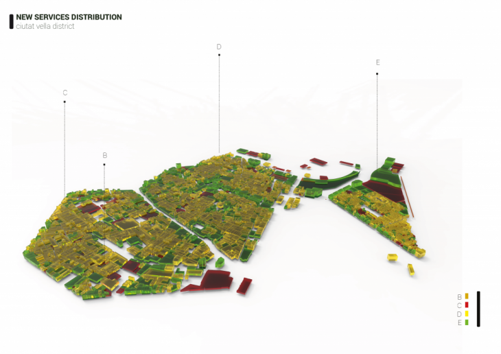 The driver of this project then turned into trying to supply or cover the current public services needs of each neighbourhood by transforming strictly all the current available areas from the city administration offices. By doing so, the lack of services would be covered on 15%.