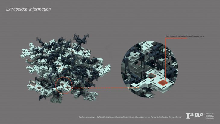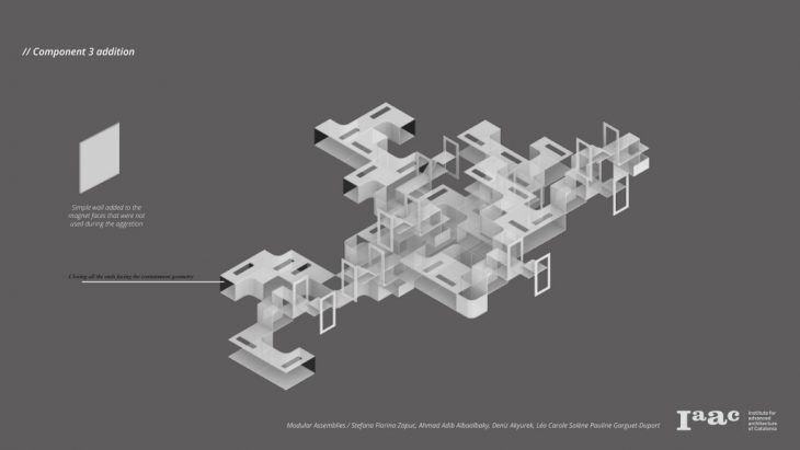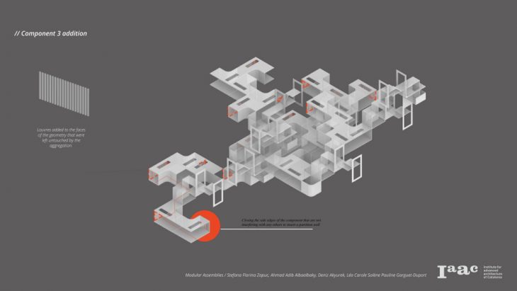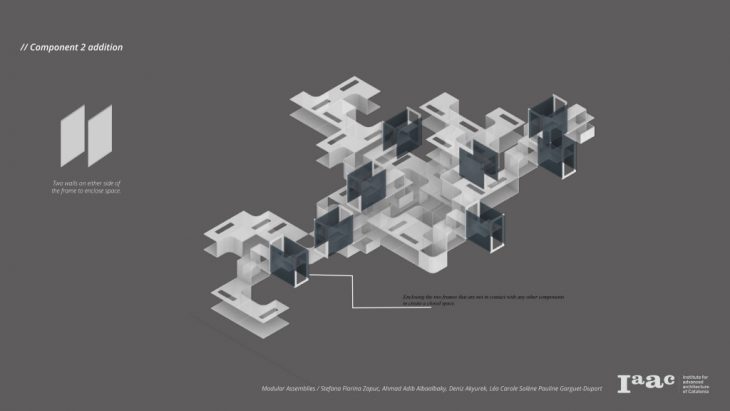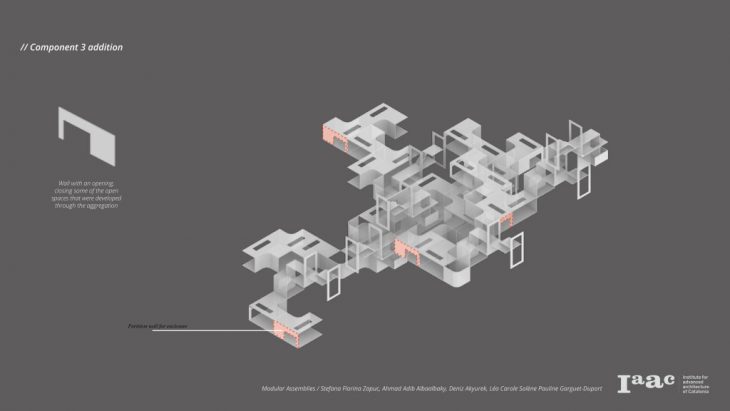 Modular Assemblies explores iterative logics that aim to create adaptive architectural networks through the aggregation of modular components. Opposed to already pre-determined spaces, the components are designed as modules with different characteristics that can provide diversity and create spatial compositions once introduced into the assembly process.
