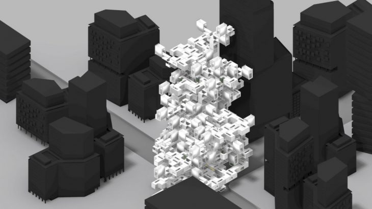 Within an urban context and scale, the growth can provoke new topological forms that can be assigned architectural functions and qualities, such as inhabitable enclosures or circulation paths and transition areas. This additional layer is addressed in the post processing section, where architectural elements such as partition walls, facades, canopies or courtyards are introduced.
