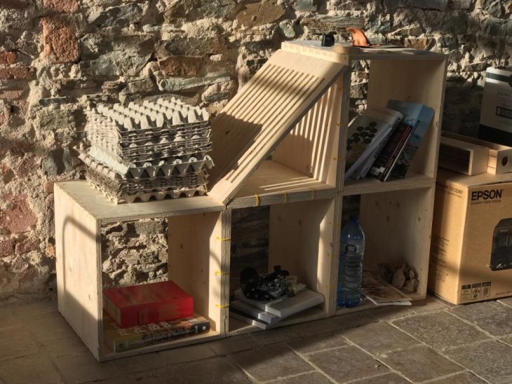 Following Le Corbusier’s ideas, a 430mm module was identified as the optimal measurement for this design. Two base geometries rectangle and triangle, identified as A and B, are combined in various ways to satisfy particular needs of the users. Storage, sitting, resting.