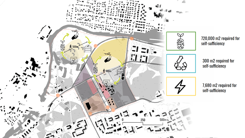 Based on the calculation, 500m with a vertical farming structure is the suitable minimal composition for a self-sufficient community. The 1st two phases starting with existing neighborhoods would form the initial self-sustaining communities. When there are changes in demand or supply based on population change, these two communities will support each other.