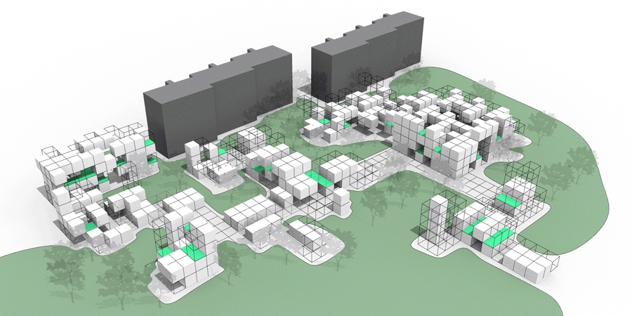 Modular(c)ity is a project that aims to propose a new and more sustainable version of the micro-district of the District of Lasnamäe in Tallin, Estonia. A more sustainable and circular district is going to be promoted by the implementation of modular structures that we will be deployed taking into account the needs of spaces and time of the current and future population.