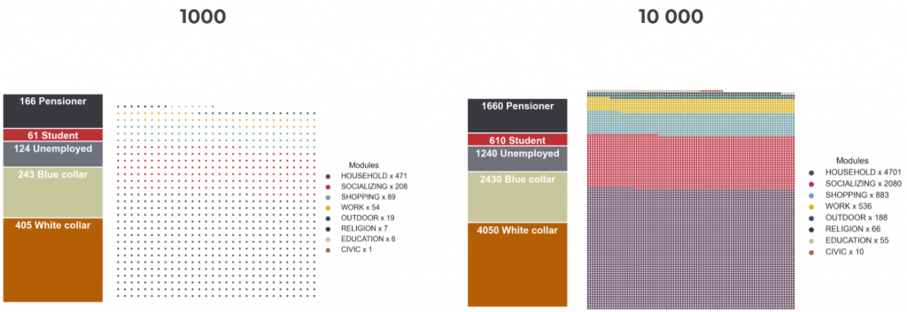 We can then evaluate the number of required modules for our population. The advantage of this approach is that the number of modules adapts to the population. Like in this example, if the population of the district goes from 1000 to 10000 people, the number of required modules could be predicted. In the same way, if the archetype’s distribution changes, the same analysis could be done.