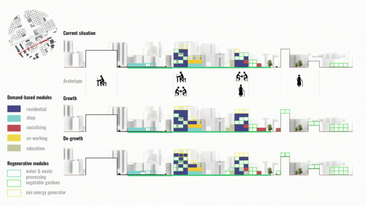 By each half and full year, the change in archetypes would affect the demand-based modules’ distribution. When there’s a growth in population, demand-based modules will grow according to archetype demands. When there’s a decrease in population, the redundant demand-based modules will be re-purposed to support self-sustainability needs.