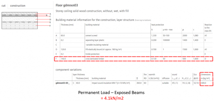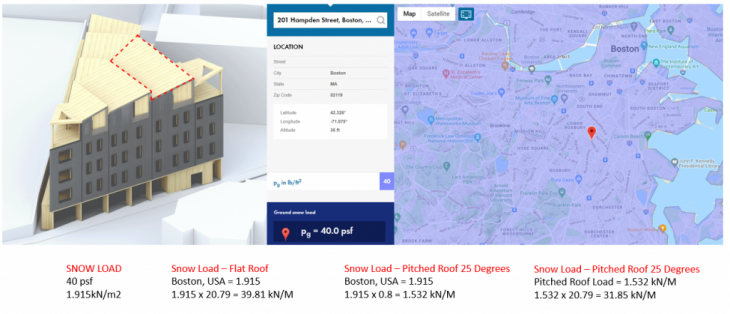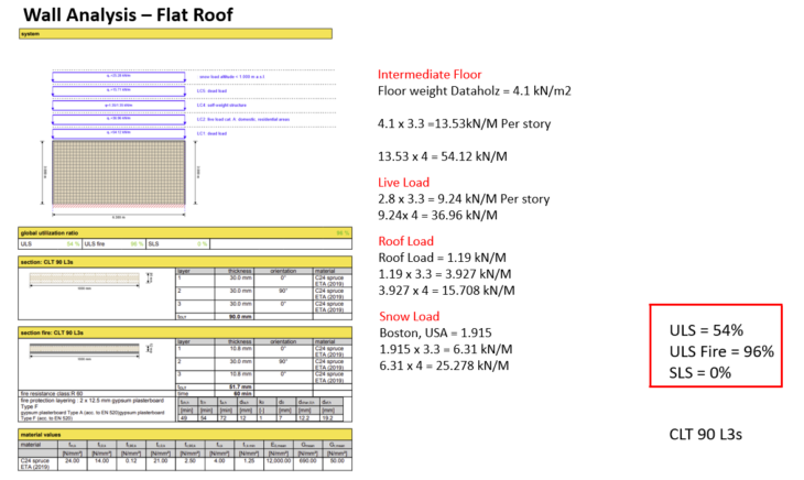 By utilizing Dataholz, we can accurately analyze mass timber products on the current designs. A CLT deck with a permanent load of 4.1 kN/m2 was chosen along with a mass timber roof deck. As the project being analyzed is in Boston in the United States , there is the potential for high snow loads, and so this must be incorporated into the analysis.